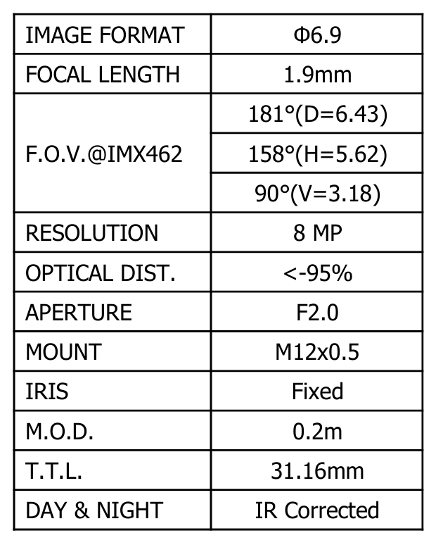 S6819020 is a 180° S-mount fisheye lens. It is designed for big image sensor more than 2/3″ ,image circle Φ6.8mm. And it is 5-8 megapixel HD board CCTV lens.