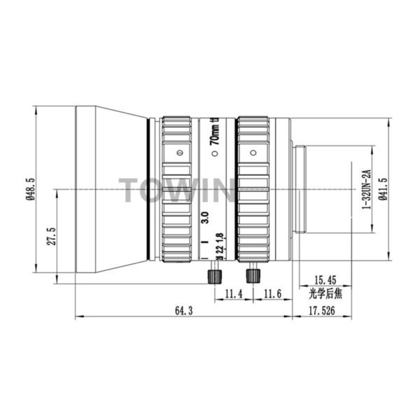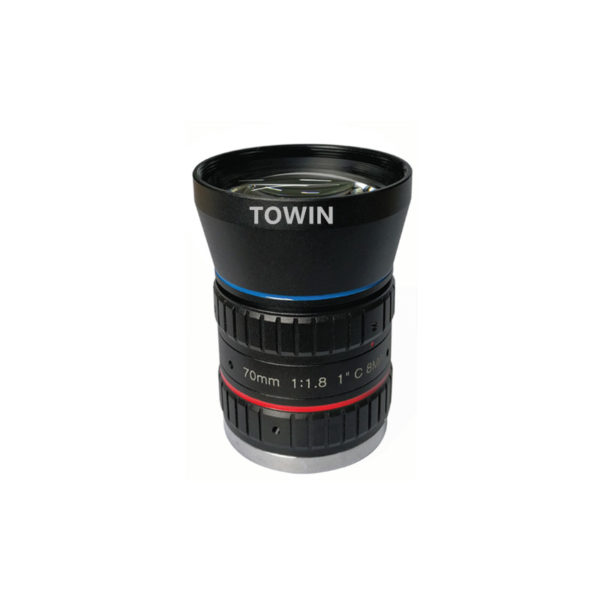 C701118M8 is a 70mm C-mount ITS traffic road CCTV lens. It is long focal lenght for HD Megapixel 1″ sensors like AR1011HS, CMV4000. It has a large aperture F1.8 manual iris for low light sensitive IP camera, security surveillance.