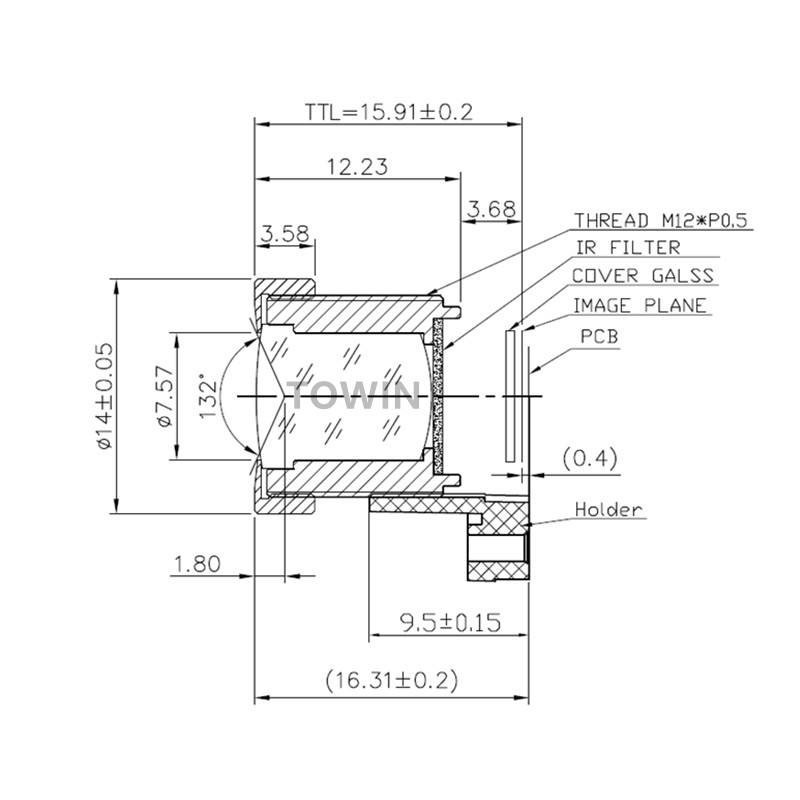 Wide Angle M12 S-mount 3.6mm board lens 1/2.3″ for MT9F002 HD 5MP HFOV 101° F2.0
