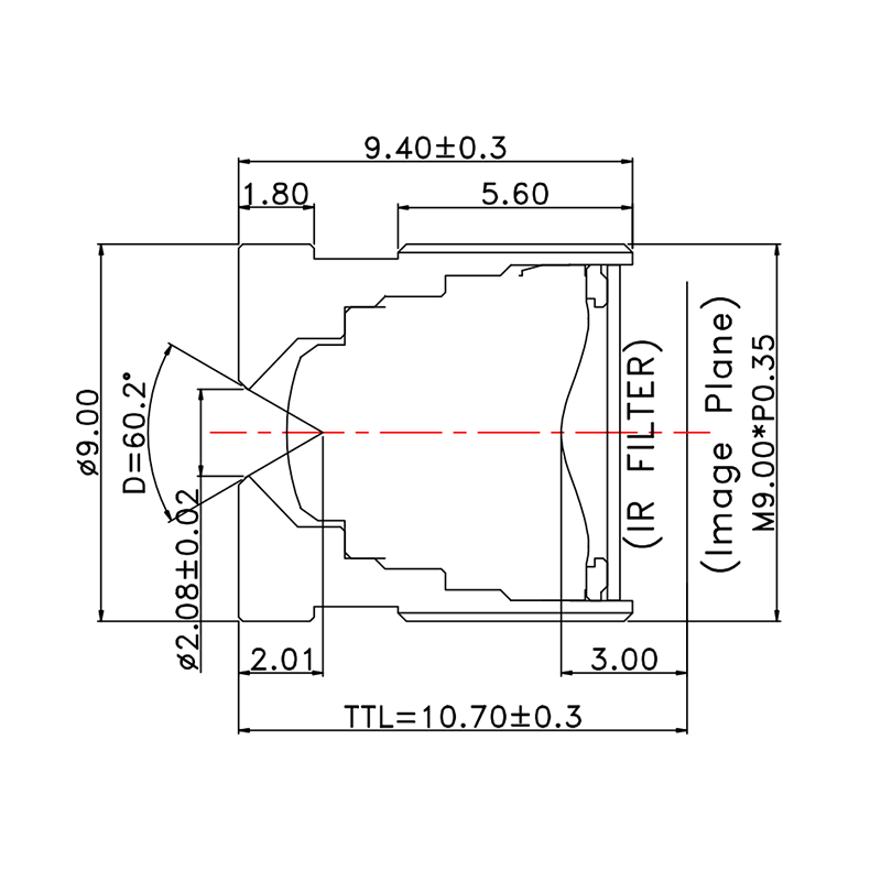 5-Megapixel Low-distortion CCTV lens with Built-In IR Filter, 1/2.5″ format, M9X0.35 mount, 60° FOV, F3.0 aperture for security surveillance.