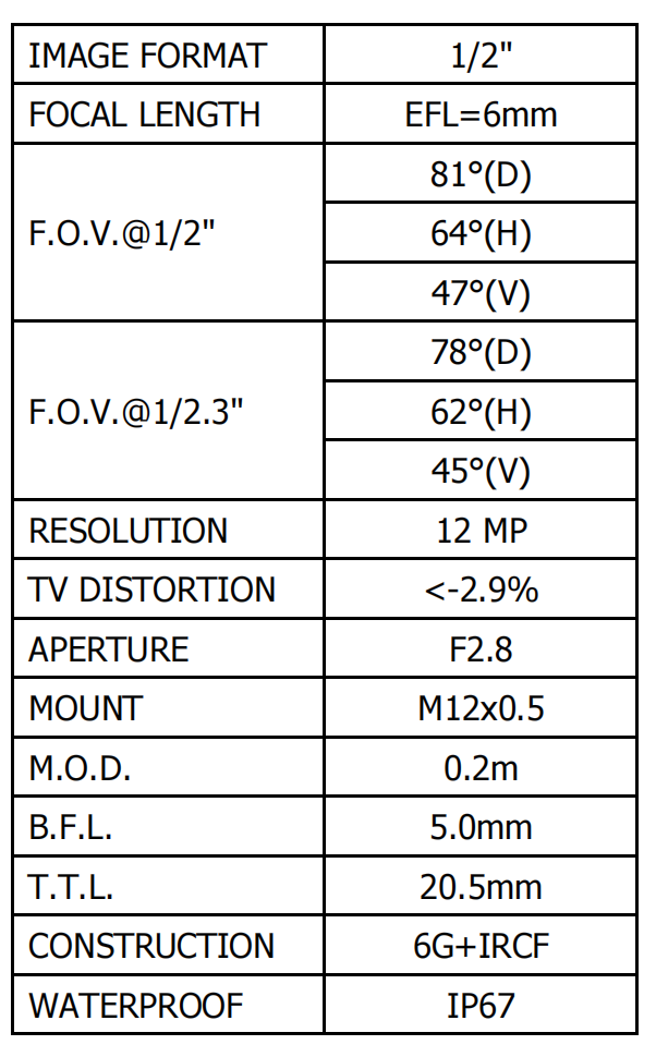 S06012006428F67 1/2.3″ wide angle 12MP Waterproof IP67 Automotive lens , well match IMX477, HFOV 62 degree, TV distortion less than 3%