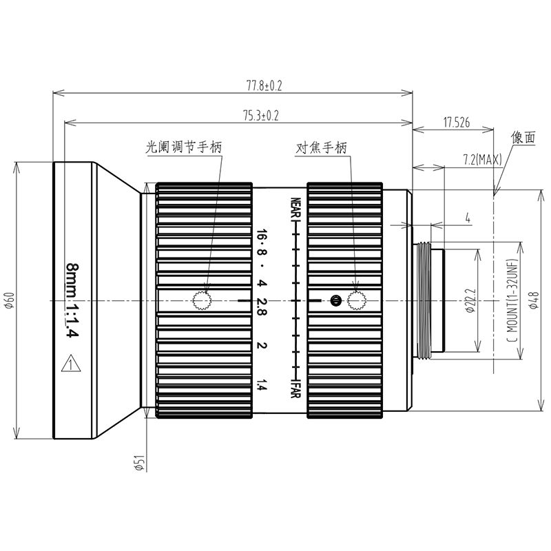 Wide-angle lens 1.1″ C-Mount HD lens, 8mm Low distortion lens, manual iris, 20-Megapixel, F1.4~16 aperture.